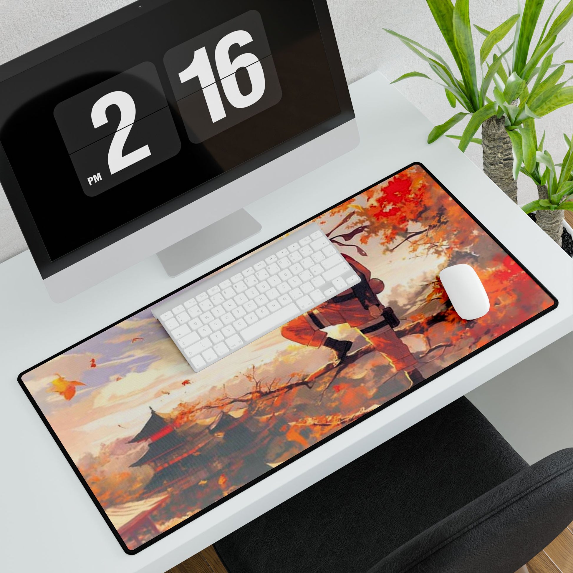A wide-format desk mat that brings cinematic anime energy to your workspace. The scene captures a lone ninja perched above a sunlit valley of pagodas and autumn trees—warm golds and burnt oranges sweep across the surface, turning a plain desk into a storytelling stage. The smooth polyester top offers effortless mouse tracking and vivid, fade-resistant print; the natural rubber base keeps the mat firmly in place during long sessions of work or play. Sized to hold keyboard and mouse, it anchors your battlestation and adds a quiet, adventurous mood to study, streaming, or design sessions.