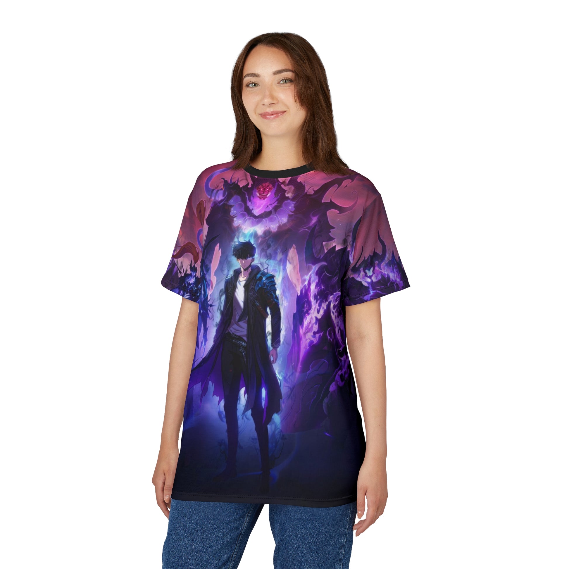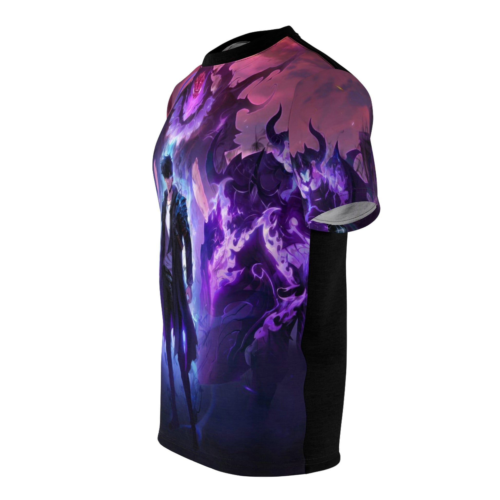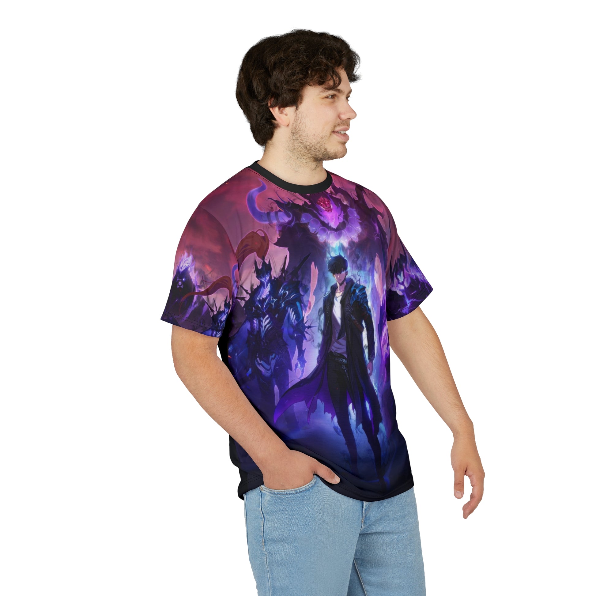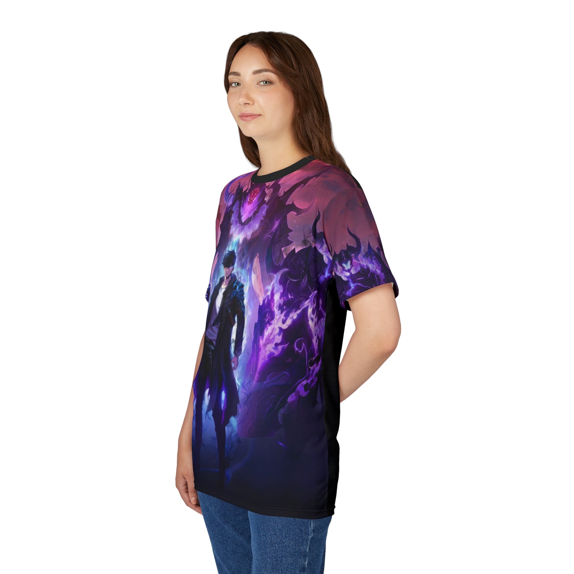 A dark, all-over print tee that reads like a page from a shadowy fantasy—smoldering embers, clawed silhouettes, and deep, blood-red highlights blend across the fabric. Lightweight polyester keeps the print crisp and vibrant while staying breathable for long wear. Slip it on for late-night game sessions, convention floors, or when you want to carry a bit of dramatic, otherworldly energy through your day. The regular fit and clean ribbed collar keep the silhouette wearable under a jacket or on its own, and the tagless finish stays comfortable during long events. Finished with reinforced side seams and shoulder tape for structure, it holds its shape so the artwork stays aligned and intense wash after wash. Product features - 100% polyester for vivid, durable all-over print - Available in two fabric weights (113 g/m² or 170 g/m²) - Side seams and shoulder tape for lasting structure - Ribbed knit collar with seam and tagless finish for comfort - Regular fit that runs true to size; assembled in the USA Care instructions - Do not dryclean - Do not iron - Tumble dry: low heat - Do not bleach - Machine wash: cold (max 30C or 90F), gentle cycle