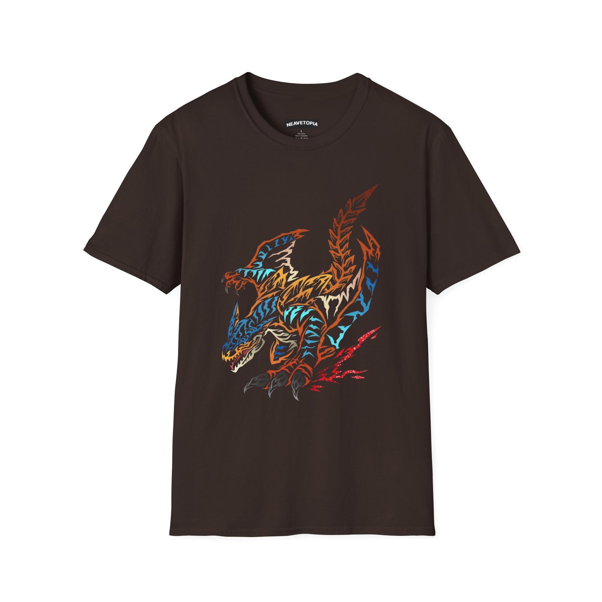 A lightweight, breathable tee that carries the energy of a hand-drawn beast across the chest. The soft ring-spun cotton feels gentle against skin while the clean crew neckline and classic fit keep the silhouette relaxed and easy to layer. The artwork — a dynamic, sketch-like creature in warm and cool tones — brings movement and attitude to everyday looks. Wear it with worn denim or under an open flannel to add a bold, artistic edge to weekend adventures or city wandering. Durable construction details (reinforced shoulder tape, ribbed collar, tear-away label) mean this shirt stands up to frequent wear while staying comfortable all day.